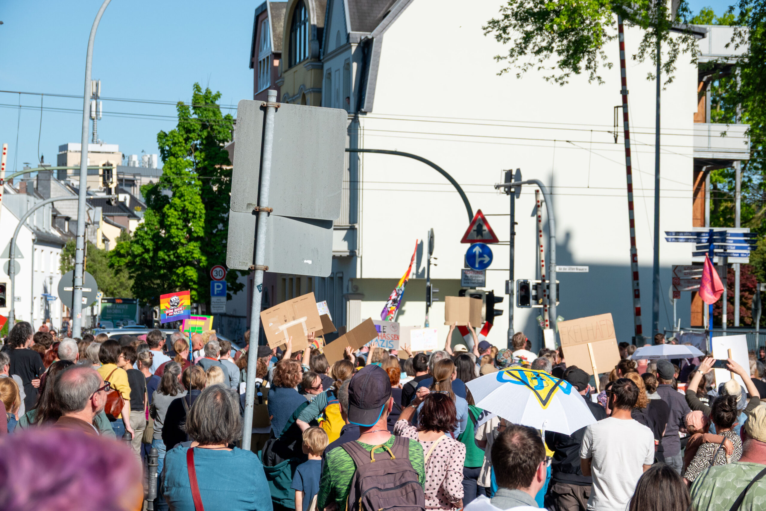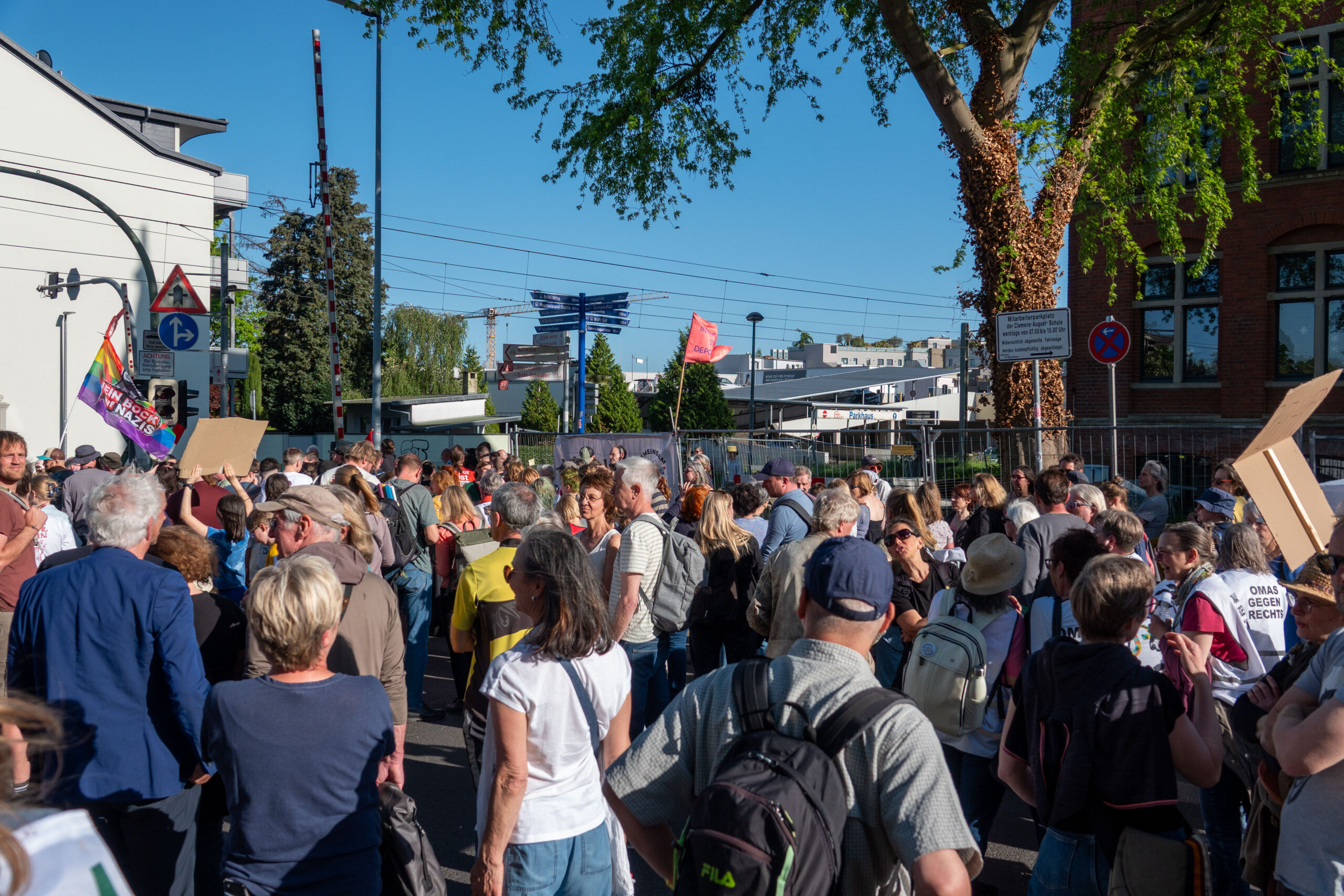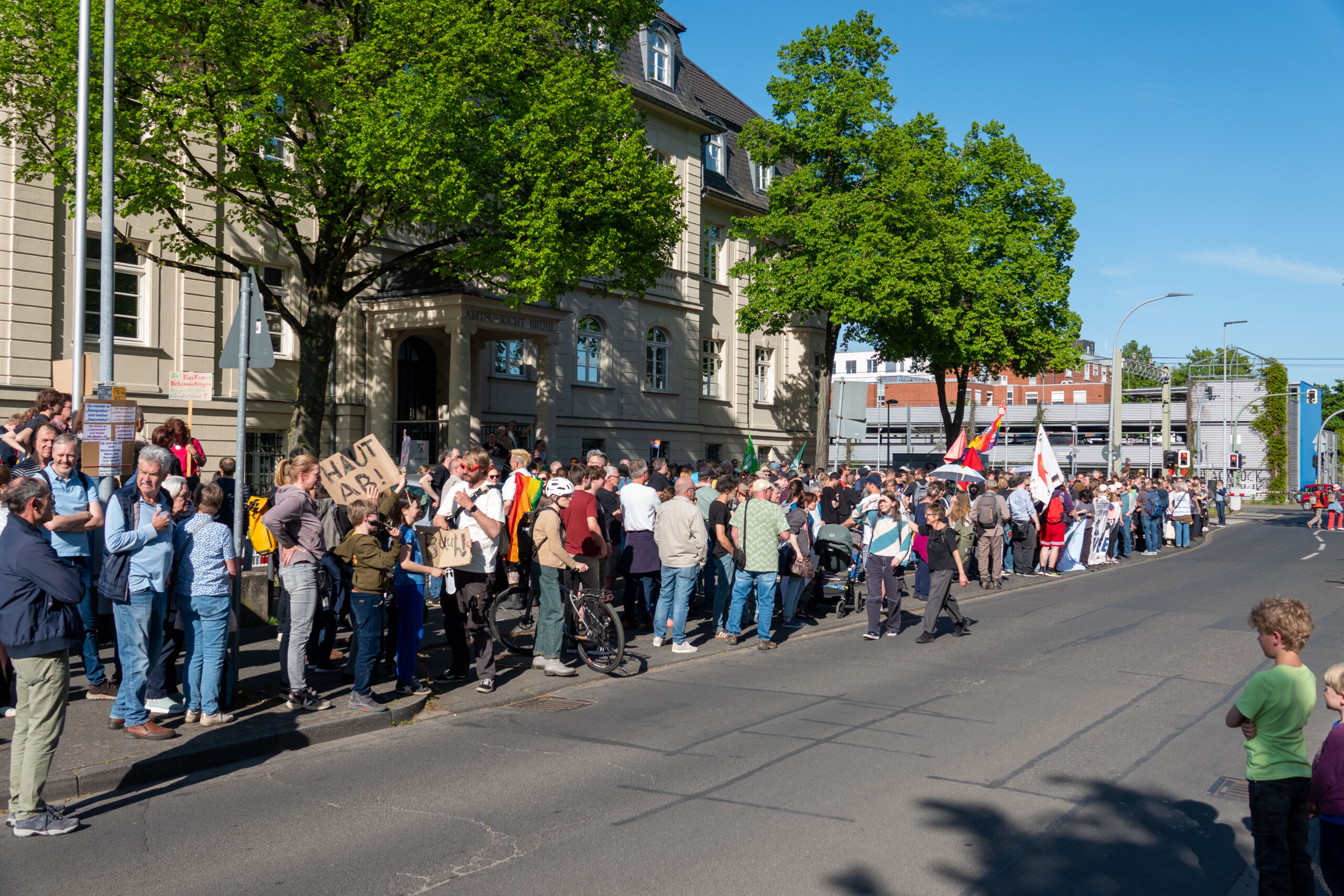 Gegen die Veranstaltung demonstrierten rund 300 Menschen friedlich vor dem Alten Amtsgericht an der Clemens-August-Straße. Die Polizei war vor Ort und sperrte wegen des großen Andrangs zeitweise einen Straßenabschnitt.